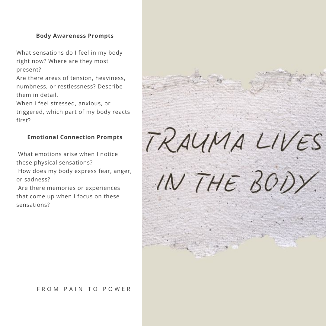Journaling is a gentle way to listen to your body and mind. These prompts are designed to help you notice where survival shows up in your body, explore the emotions tied to it, and begin the process of releasing stored tension.