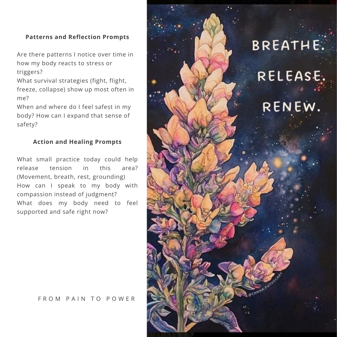 Journaling is a gentle way to listen to your body and mind. These prompts are designed to help you notice where survival shows up in your body, explore the emotions tied to it, and begin the process of releasing stored tension.